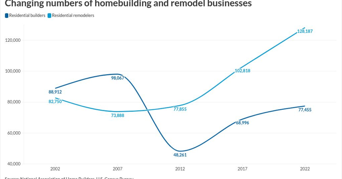 In the subsequent 15 years, the number of remodeling companies has since grown by 73.4%, while the number of builders shrank by 21%.