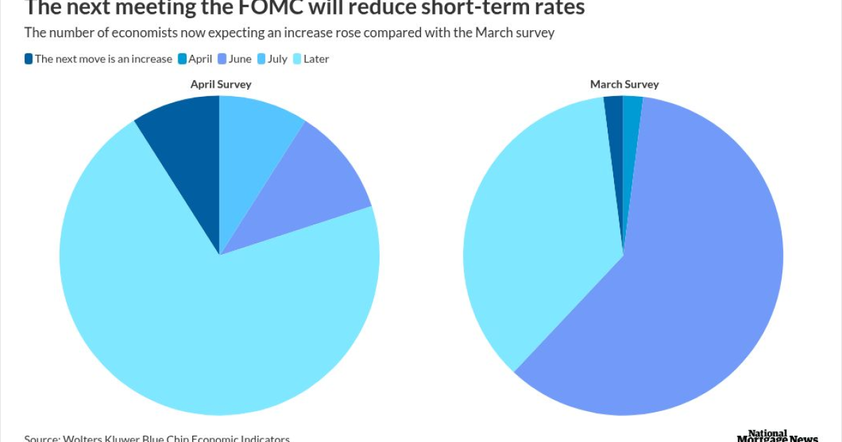 “Although futures markets show an expectation of a steady federal funds rate over the balance of the year, the Blue Chip panel expects a cut of 25 basis points by the end of 2026,” the commentary in the April report said.