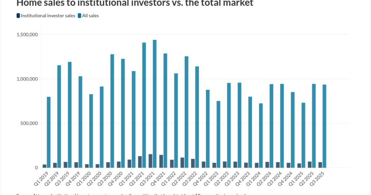 Single-family home purchases by nonlending that bought at least 10 properties as investors in a calendar year bought 63,676 properties in 2025, representing 6.8% of the market, according to Attom. That percentage has run consistently in the single digits.